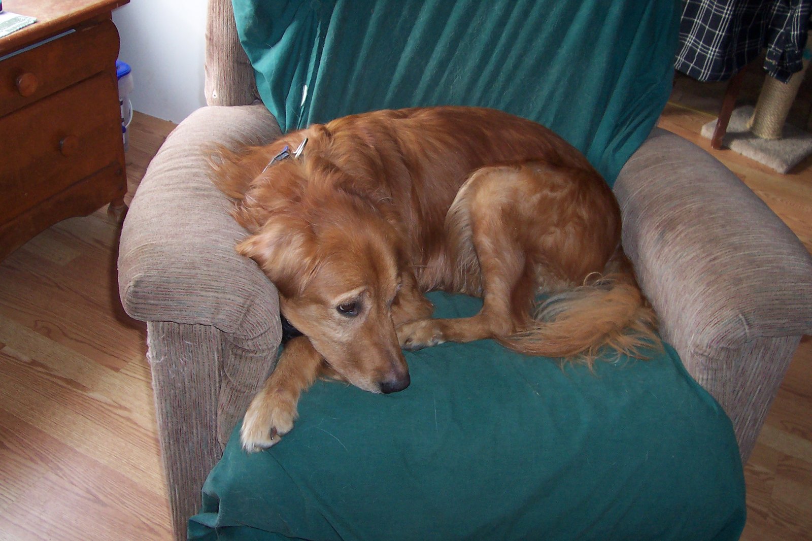 Murphy was found abandoned in Corning, NY in October, 2009. After some diligent veterinarian care the worms, fleas, mites, and matted hair were gone, and Murphy came up for adoption. A friend of mine at work is very involved in GRROWLS . Knowing we had just lost two of our four very close canine companions in September, 2009, she approached me and said she had a wonderful dog and asked if we would consider adopting Murphy. My husband and I were not looking to adopt quite so soon after losing our other two dogs, but the opportunity to rescue a fine dog could not be passed up. We said yes; and in early November, 2009, Murphy was a member of our family. Having been on his own on the streets of Corning, he developed some habits that needed to be eliminated. He is a very intelligent dog, and he has learned that his old habits are not necessary anymore. However, he also came to us with some obviously good training from his original owner, whoever he was. He comes when he is called (most of the time), and he sits up so sweetly when he wants to go for a ride or is begging for a treat. We have three cats, and Murphy and they had to come to understandings. At this point in time, all three cats rub him when he is in the room. If he is not enjoying it, he is certainly tolerating it. He has become great friends with our little Eve, a 4-year-old mixed breed. Our 11-year-old Rottweiler, Pogo, tolerates Murphy but also lets him know when he oversteps his boundaries (whether he actually has or not, you have to know Pogo). Murphy has been with us a few months now and knows we are his new people, and he has a new permanent home. He has all sorts of room to run and hunt for mice in the pastures. We have 4 horses which he will readily bark at but not approach! Murphy is a great joy in our lives. What a personality he has. He is constantly making us laugh with his antics. Thank you GRROWLS for a great job in helping to find these wonderful Golden Retrievers the homes they deserve. Sincerely, Jan Harrington |